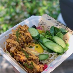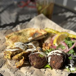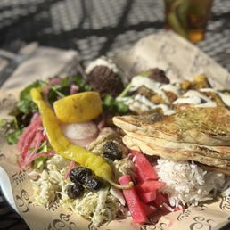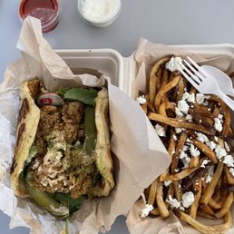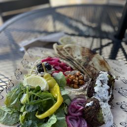 Decided upon lunch at this nifty outdoor spot in a bustling part of town on a Saturday around 12:30pm. While I know parking is usually a headache with the metered parking spots lining the businesses, I understand down the street and to the right there are many alternative parking spaces in the residential neighborhoods. The outdoor space was self seating; not quite first come first serve as patrons waiting for tables were taken to the next available table in the order they arrived. Our food came out incredibly quick with all necessary condiments and items including ketchup, silverware, and napkins. Each the falafel and the gyro were monstrously packed with flavor. A double edged sword at times as it almost felt a race against the clock to finish our meal (or at least transfer platewear) to avoid the juice and garnishes from seeping into the bread and making it soggy. The fries satiated the desire for greasy food without drawing a pool of oil. Overall, a really great spot for quick and flavor packed meals.